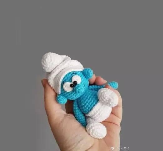 Referring to the photo, sew all the parts, securing them with pins for convenience. The crocheted mini Smurf is ready!
